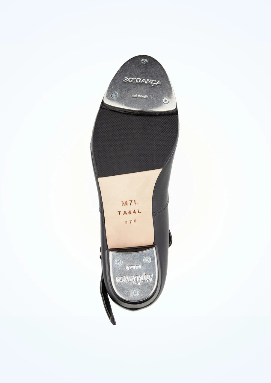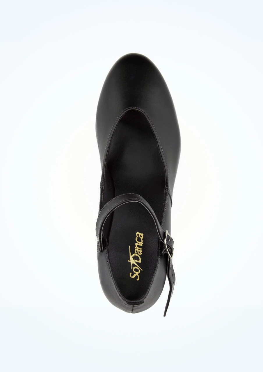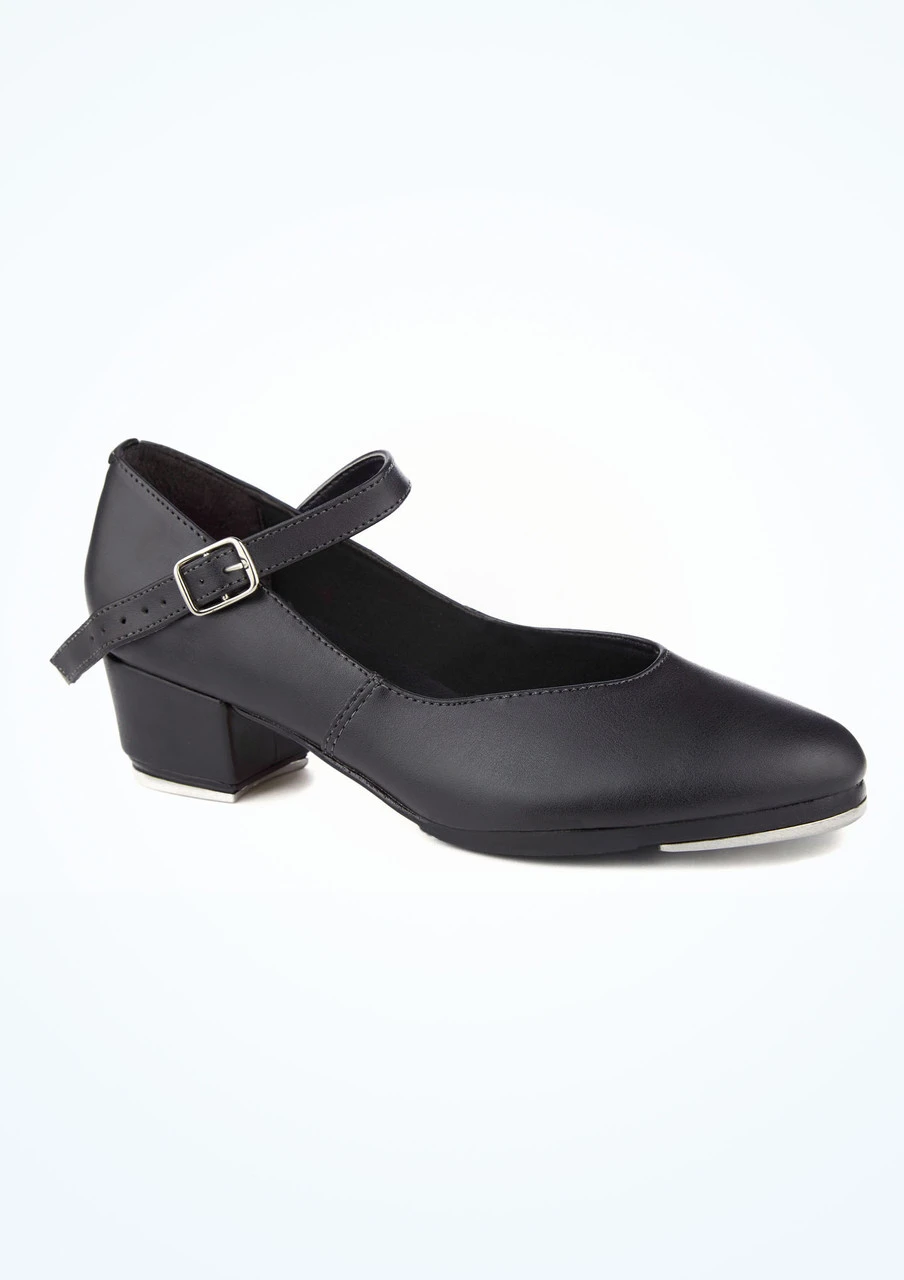 A synthetic leather buckle strap tap shoe with cuban heel from So Danca. Man-made upper and comfortable cushioned lining with taps attached on the heel and toe.