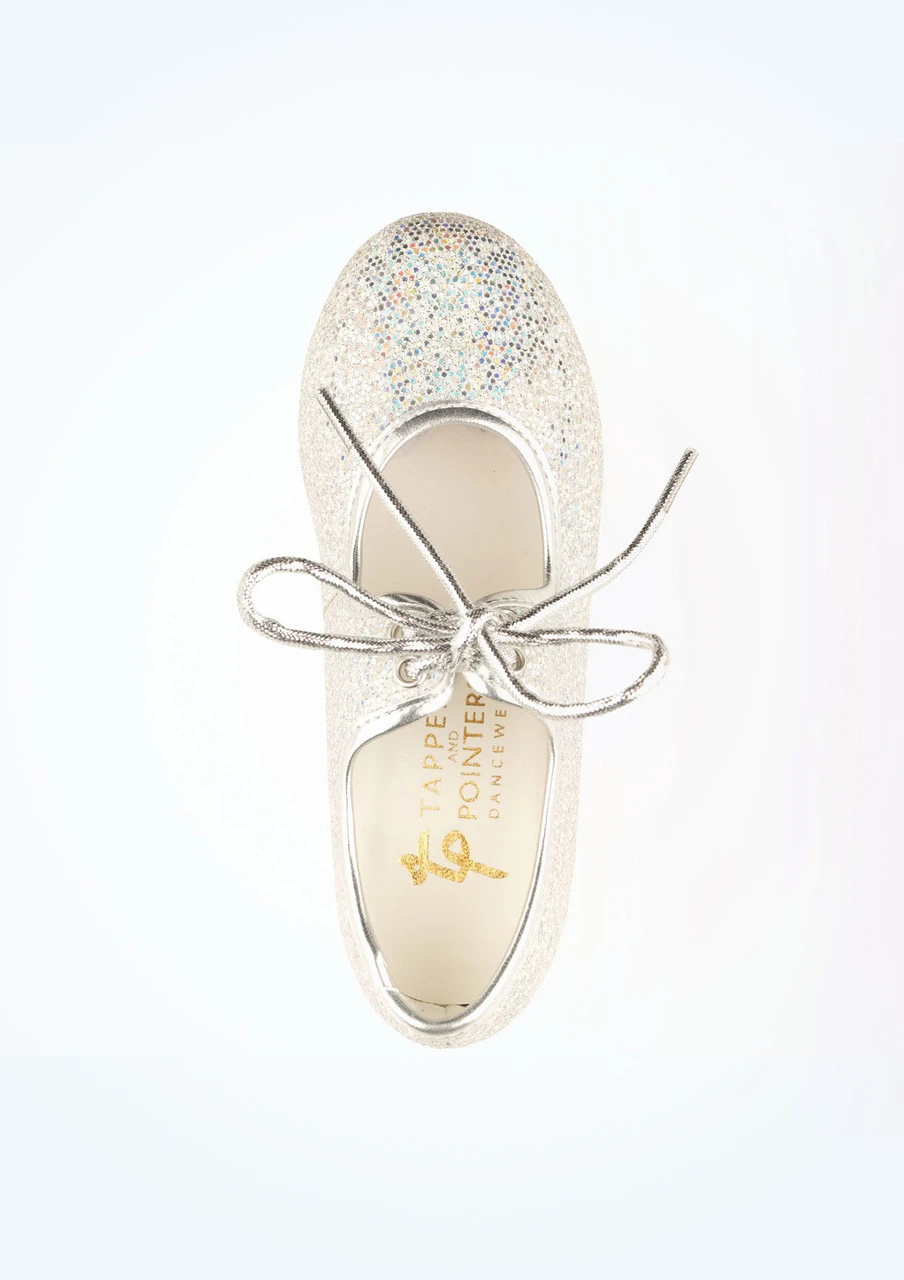 Quality beginners tap shoes from Tappers and Pointers in a hologram finish with laces and plain silver heel. The recently revised design of these dance shoes now suits wider feet too.