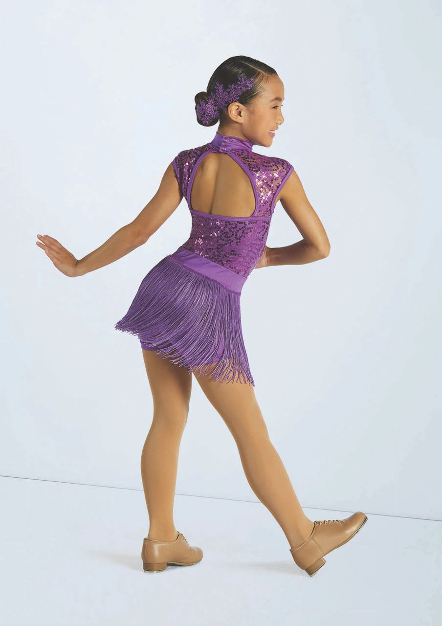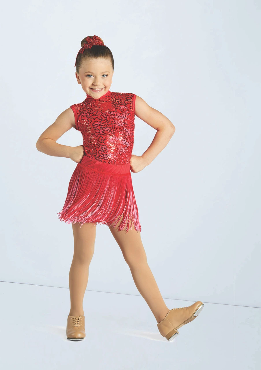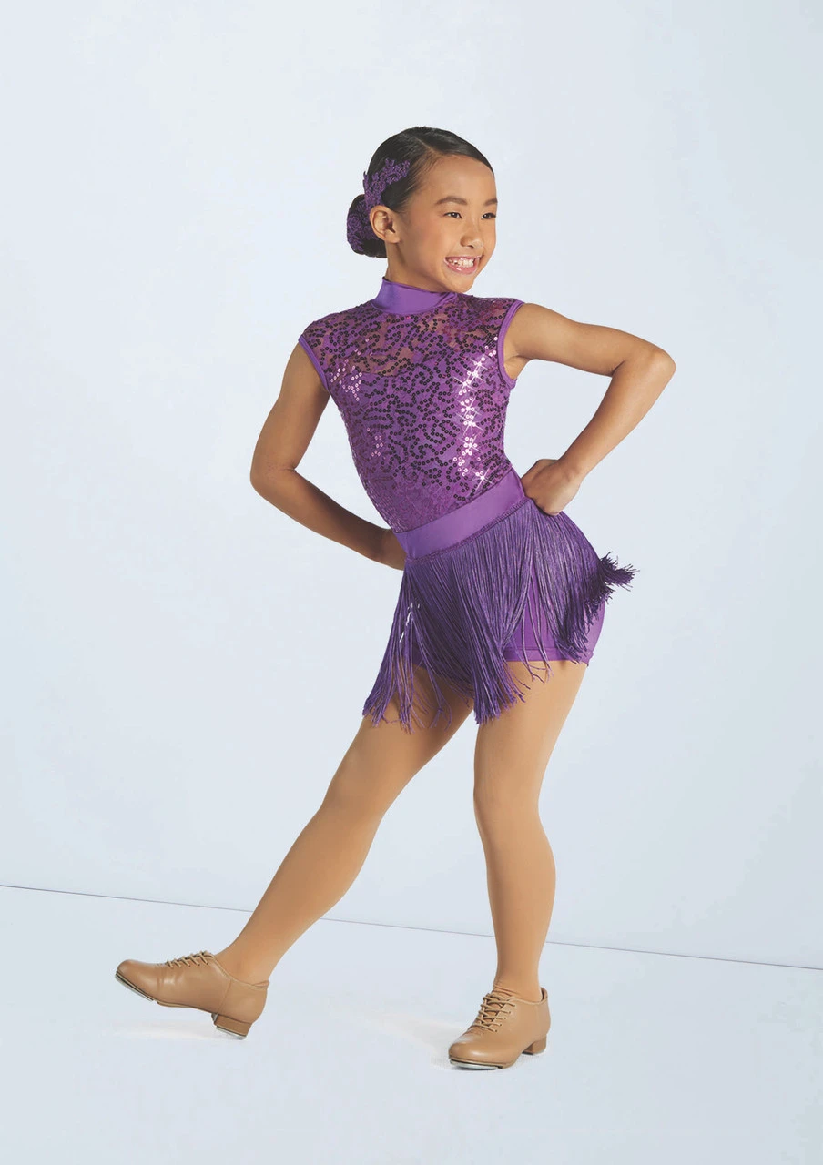 Three piece costume includes biketard, tutu and fringe skirt
