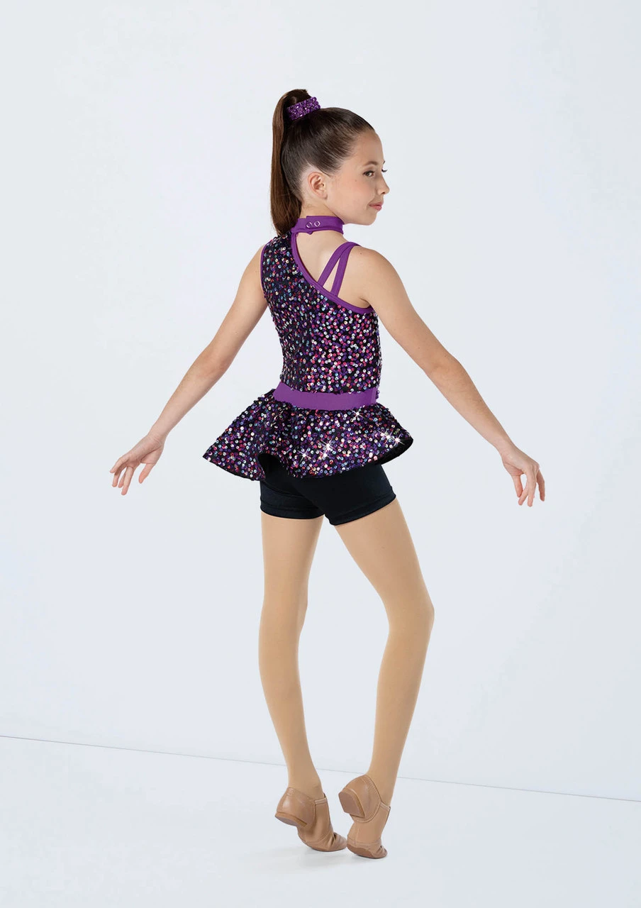 -Asymmetric peplum biketard features Razzle Dazzle sequin spandex