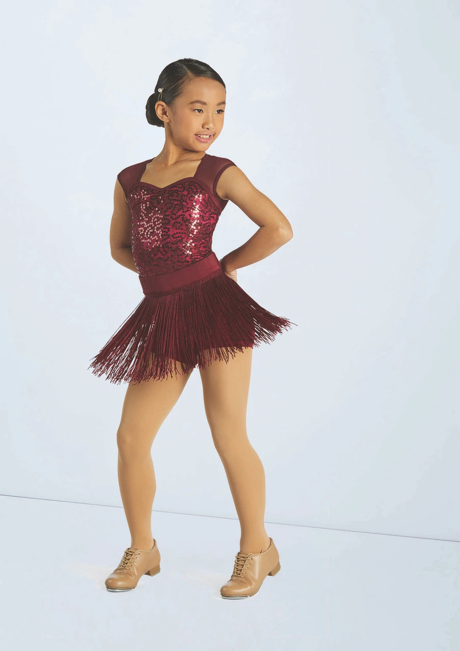 Three piece costume includes biketard, tutu and fringe skirt