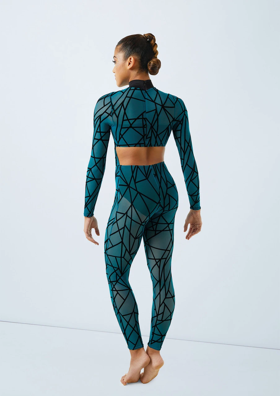 Make a bold statement in this fun geometric unitard with a flattering back cut out. The unitard has an attached bodice and briefs and lined bra and crotch so you can dance in comfort and confidence. The V neck cut out is flattering and the black neckline contrasts with the mesh geometric print.