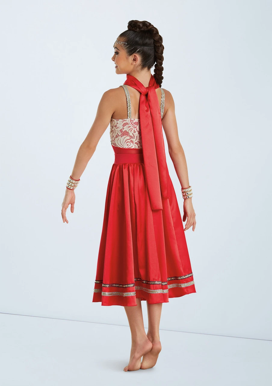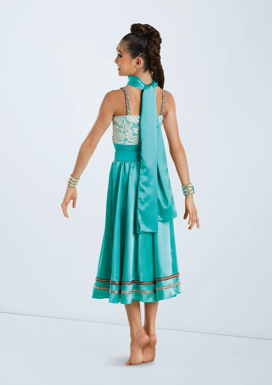 Dance your heart out in this Bollywood-inspired shiny spandex dress with metallic detailing. The long skirt is trimmed with sequined ribbon which matches the detailing on the bodice. Wear the included accessories to complete the look.