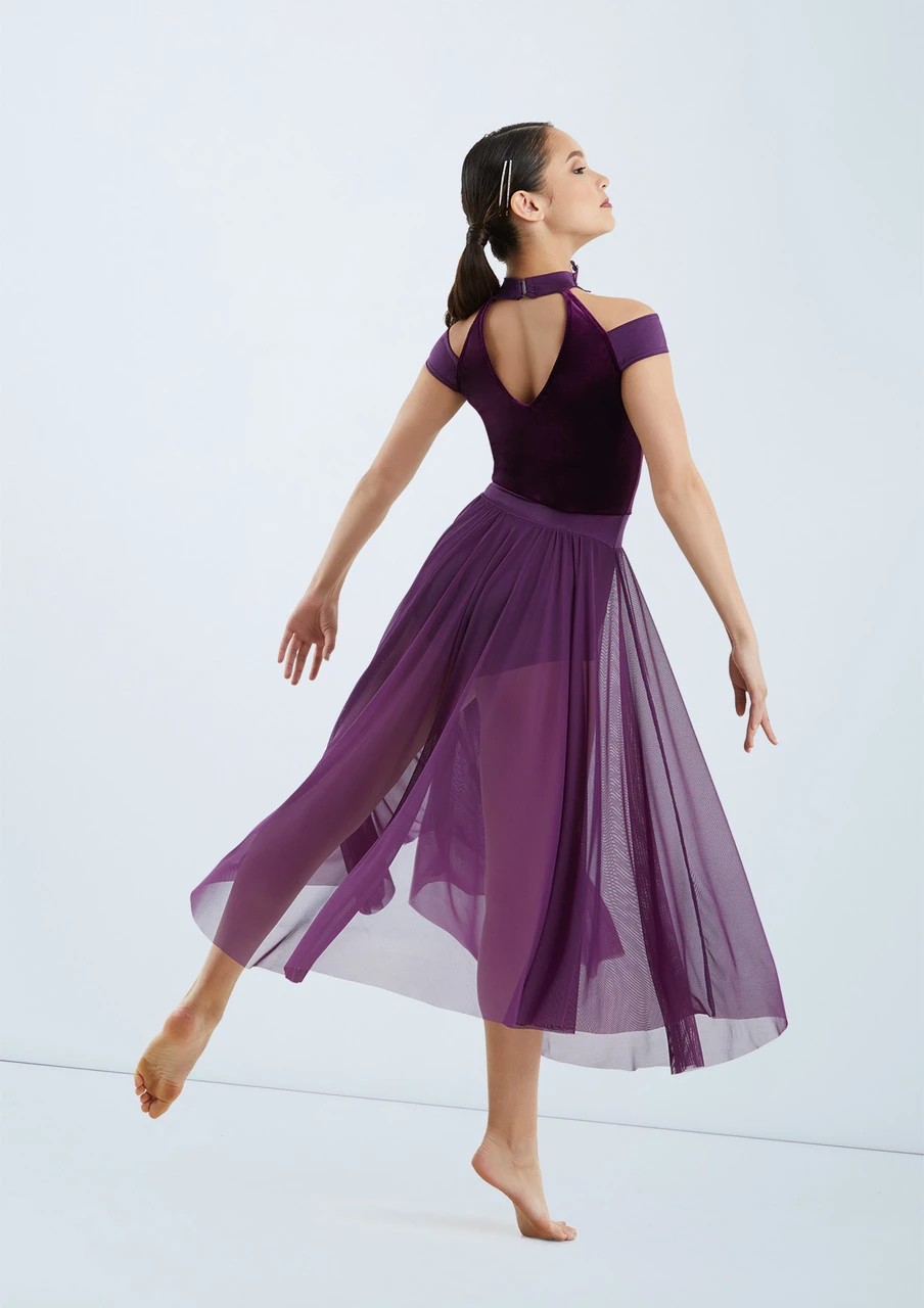 Turn heads in this velvet leotard with an attached back panel skirt which creates a strong look. The velvet bodice has a fully-lined mesh insert in a strip down the front of the leotard, matching the material for the flowing back skirt. The cold shoulder style is edgy and flattering and the included hair accessory completes the look.